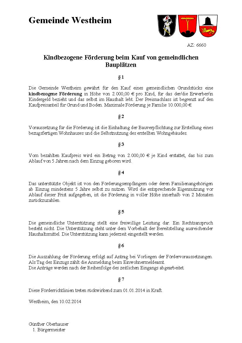 Die Gemeinde Westheim gewährt für den Kauf eines gemeindlichen Grundstücks eine kindbezogene Förderung in Höhe von 2.000,00 € pro Kind, für das der/die Erwerber/in Kindergeld bezieht und das selbst im Haushalt lebt. Der Preisnachlass ist begrenzt auf den Kaufpreisanteil für Grund und Boden. Maximale Förderung je Familie 10.000,00 €.