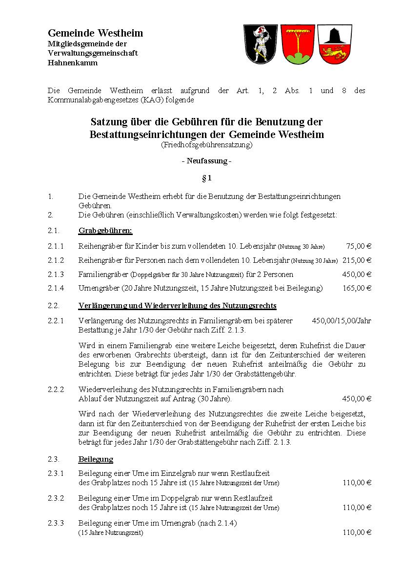 Satzung über die Gebühren für die Benutzung der Bestattungseinrichtungen Westheim ab 01.01.2016