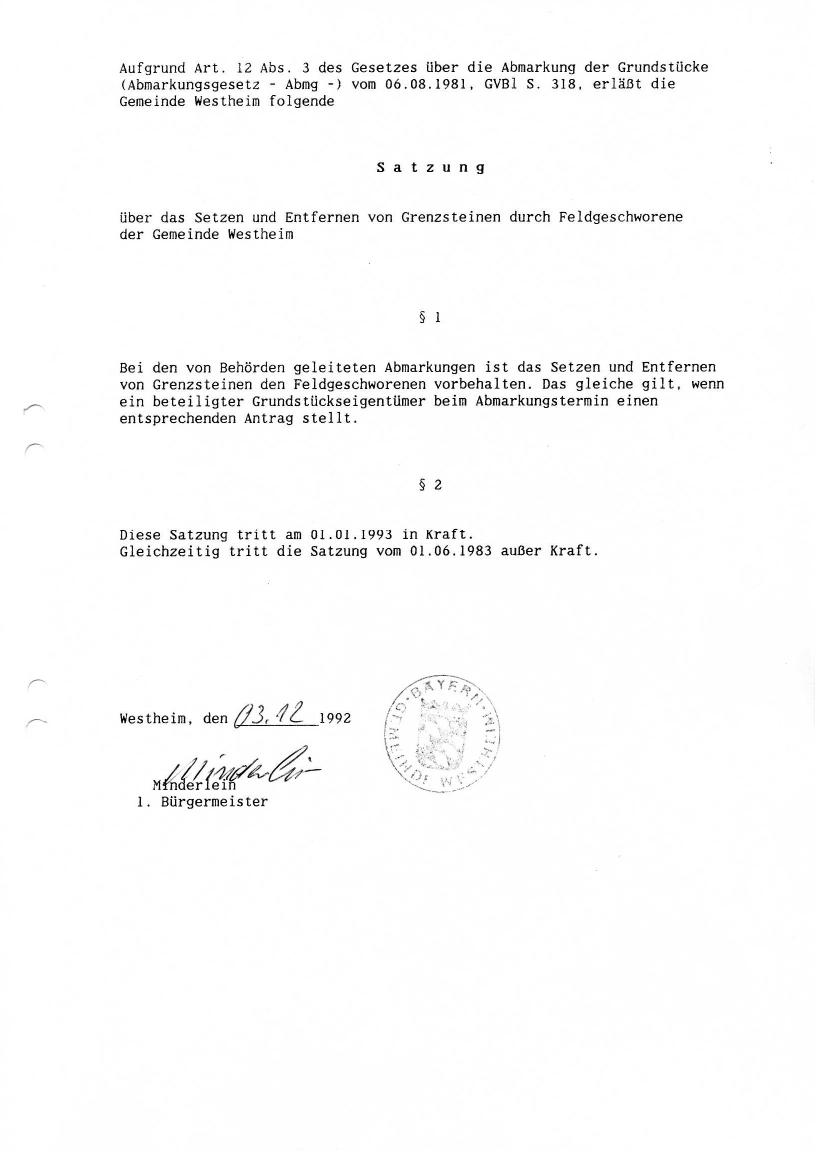 Satzung über das Setzen und Entfernen von Grenzsteinen durch Feldgeschworene ab 01.01.1993