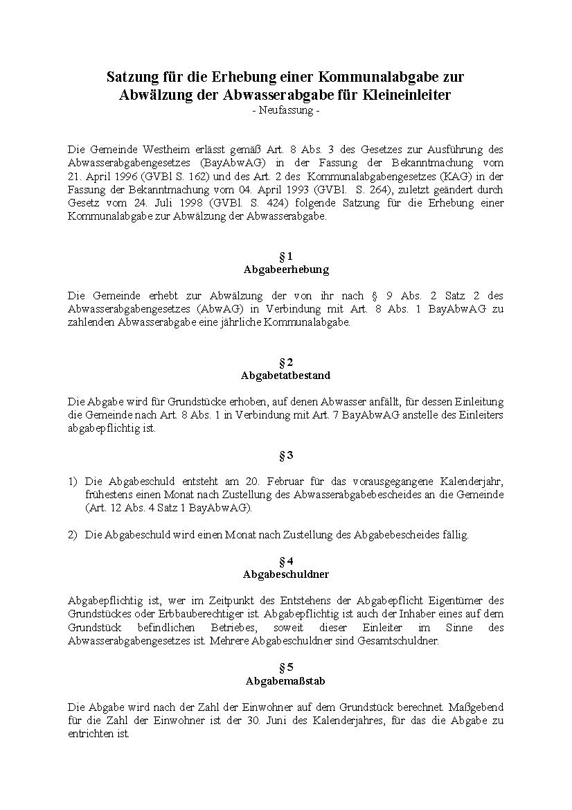 Satzung für die Erhebung einer Kommunalabgabe zur Abwälzung der Abwasserabgabe für Kleineinleiter