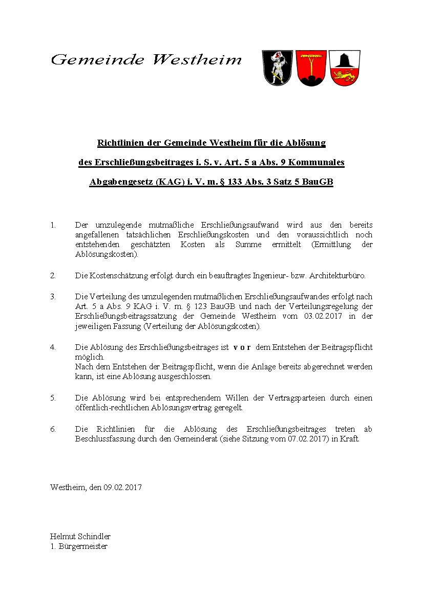 Richtlinien für die Ablösung des Erschließungsbeitrages der Gemeinde Westheim ab 07.02.2017